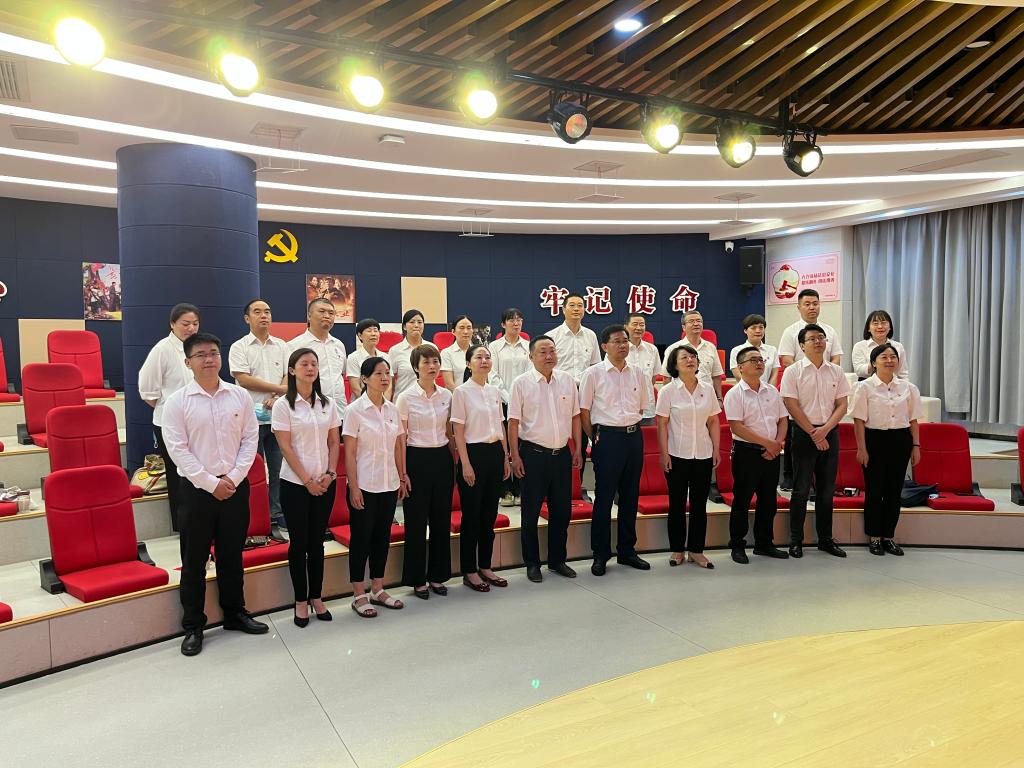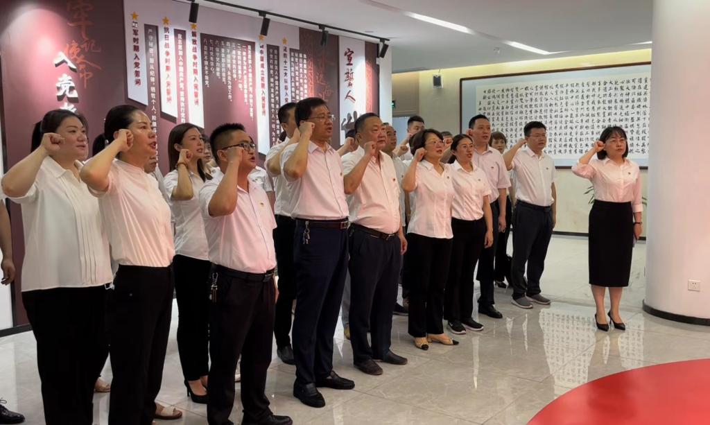 宣誓廳里,在領(lǐng)誓人的帶領(lǐng)下,全體黨員舉起右拳,用鏗鏘有力的聲音重溫入黨誓詞,錚錚誓詞激勵(lì)著在場(chǎng)的每一名共產(chǎn)黨員。