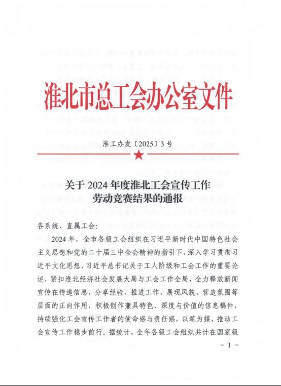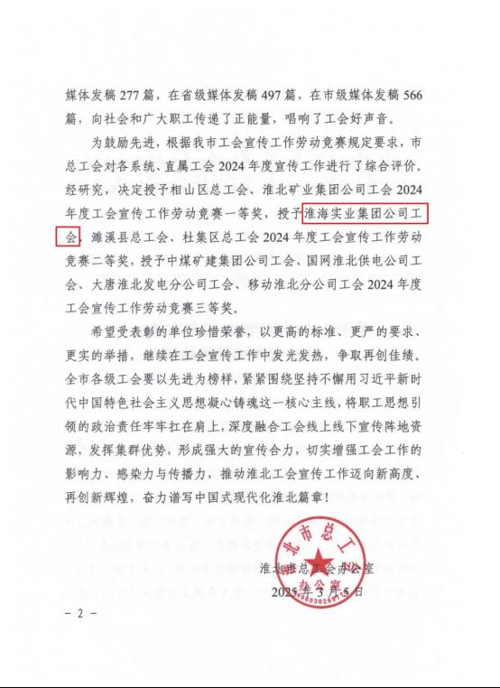 3月6日,淮北市總工會召開十三屆三次全委(擴大)會議。會上通報了2024年度全市“五型工會”勞動競賽優(yōu)勝單位、宣傳工作勞動競賽結(jié)果和市總工會委員會優(yōu)秀委員。淮海實業(yè)集團工會獲2024年度“五型工會”勞動競賽二等獎、全市工會宣傳工作勞動競賽二等獎,集團工會副主席朱建華獲評市總工會委員會優(yōu)秀委員,并在會上做交流發(fā)言。