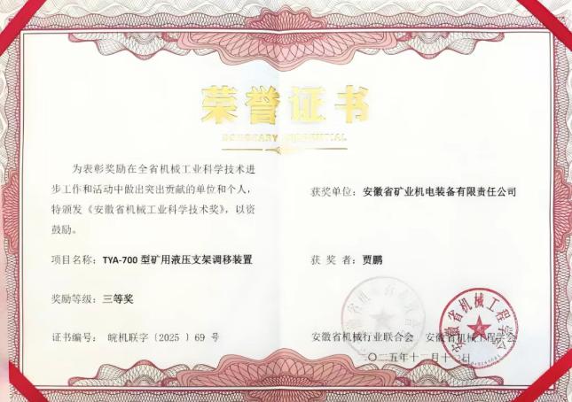 2025年度安徽省機(jī)械工業(yè)科學(xué)技術(shù)獎獲獎名單日前正式公布。安徽礦機(jī)自主研發(fā)的“TYA-700型礦用液壓支架調(diào)移裝置”成功斬獲三等獎!
