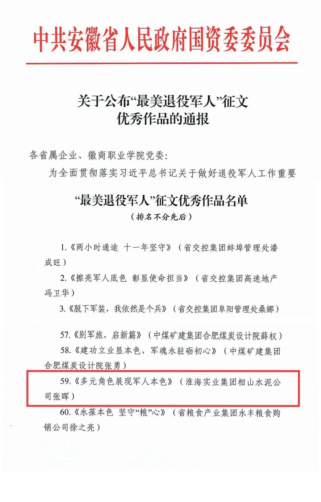 為深入落實(shí)習(xí)近平總書記關(guān)于退役軍人工作重要指示批示精神,大力營(yíng)造尊崇、關(guān)愛退役軍人的濃厚氛圍,省國(guó)資委黨委在省屬企業(yè)開展“最美退役軍人”征文活動(dòng)。淮海實(shí)業(yè)集團(tuán)推薦的《多元角色展現(xiàn)軍人本色》獲評(píng)優(yōu)秀作品。